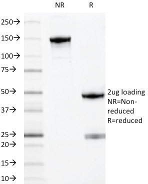 Recognizes a myeloid associated differentiation antigen in the cytoplasm of mature granulocytes. It shows no reactivity with any other cell type in human tissues. Markers of myeloid cells are useful in the identification of different levels of cellular differentiation. It reacts with early precursor and mature forms of human and monkey myeloid cells. This MAb is useful for the detection of myeloid leukemias and granulocytic sarcomas. It can be used as a marker of granulocytes in normal tissues or inflammatory processes.