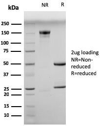 Myogenin is a member of the MyoD family of myogenic basic helix-loop-helix (bHLH) transcription factors that also includes MyoD, Myf-5, and MRF4 (also known as herculinor Myf-6). MyoD family members are expressed exclusively in skeletal muscle and play a key role in activating myogenesis by binding to enhancer sequences of muscle-specific genes. The regulatory domain of MyoD is approximately 70 amino acids in length and includes both a basic DNA binding motif and a bHLH dimerization motif.MyoD family members share about 80% amino acid homology in their bHLH motifs.Anti-myogenin labels the nuclei of myoblasts in developing muscle tissue, and is expressed in tumor cell nuclei of rhabdomyosarcoma and some leiomyosarcomas. Positive nuclear staining may occur in Wilms’ tumor.
