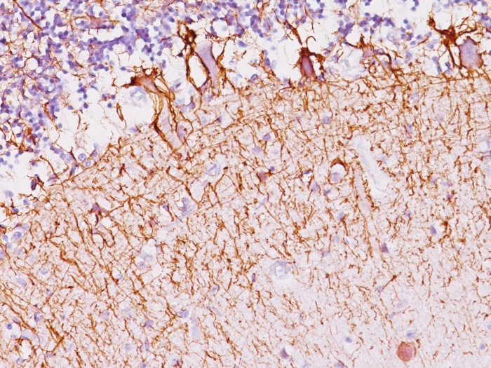 This MAb reacts with a 200kDa and 68kDa protein, identified as heavy and light sub-units of neurofilaments (NF-H NF-L). Neurofilaments make up the main structural elements of axons and dendrites and are found in neurons, peripheral nerves, and sympathetic ganglion cells. Neurofilaments consist of three major subunits with molecular weights of 68kDa (NF-L), 160kDa (NF-M) and 200kDa (NF-H). Anti-neurofilament stains a number of neural, neuroendocrine, and endocrine tumors. Neuromas, ganglioneuromas, gangliogliomas, ganglioneuroblastomas, and neuroblastomas stain positively for anti-neurofilament. Neurofilaments are also present in paragangliomas as well as adrenal and extra-adrenal pheochromocytomas. Carcinoids, neuroendocrine carcinomas of the skin, and oat cell carcinomas of the lung also express neurofilament.