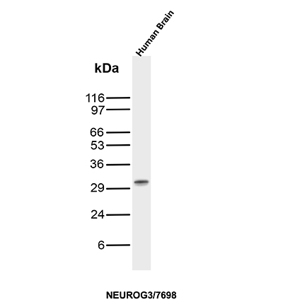 This antigen is a transcription factor that interacts with NKX2-2 to regulation transcription of NEUROD1. The neurogenin family of proteins belongs to the basic helix-loop-helix (bHLH) superfamily and consists of Neurogenin 1, Neurogenin 2 and Neurogenin 3 (also designated ngn3). bHLH members are transcriptional regulators that determine cell fate. Neurogenin 3 is expressed in discrete regions of developing neurons and in the embryonic pancreatic islets of Langerhans. HNF-6 (hepatocyte nuclear factor 6) acts as a positive regulator of Neurogenin 3 by binding to and stimulating the neurogenin gene promoter. Neurogenin 3 is involved in the initial differentiation of the four islets cell types, while a network of transcription factors, including Hlxb9, Isl1, NeuroD, Nkx-2.2, Nkx-6.4, Pax-4, Pax-6, PDX-1 and Mash1, are required for final differentiation. Neurogenin 3 acts upstream of NeuroD in a bHLH cascade. Neurogenin 3 activates the expression of NeuroD at the onset of islet cell differentiation through box sequences E1 and E3 in the NeuroD promoter.