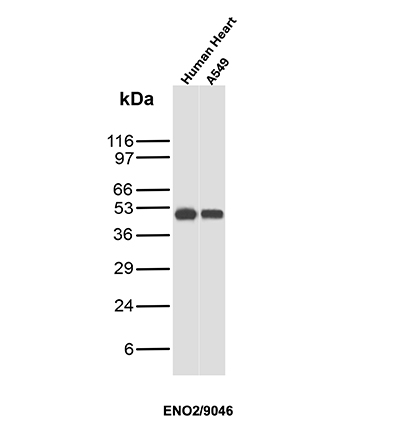 This monoclonal antibody recognizes a protein of about 50kDa, which is identified as gamma-enolase. Three isoenzymes of enolases are identified, alpha, beta and gamma. Alpha-isoform is expressed in most tissues, whereas beta-form is expressed predominantly in muscle tissue whereas gamma-enolase is found only in nervous tissue. These isoforms exist as both homodimers and heterodimers, and they play a role in converting phosphoglyceric acid to phosphenolpyruvic acid in the glycolytic pathway. NSE-gamma is a useful marker to identify peripheral nerves and tumors of neuro-endocrine origins, such as pheochromocytomas.It it be usually employed in combination with other markers such as Synaptophysin, �Chromogranin A, and Neurofilament.