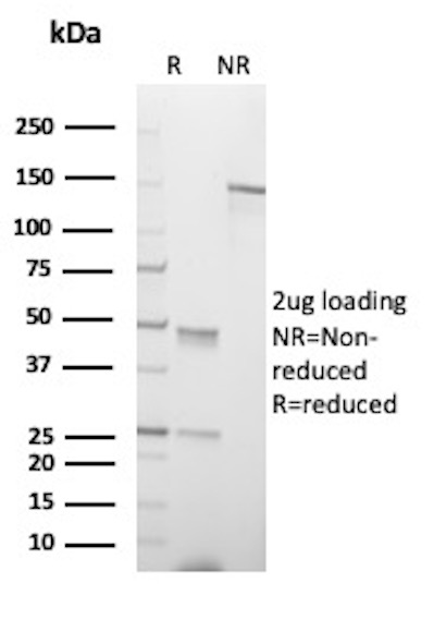 The specificity of this monoclonal antibody to its intended target was validated by HuProtTM Array, containing more than 19,000, full-length human proteins. Recognizes a 53kDa protein, which is identified as p53 suppressor gene product. It reacts with the mutant as well as the wild form of p53. It is a tumor suppressor protein expressed in a wide variety of tissue types and is involved in regulating cell growth, replication, and apoptosis. It binds to MDM2, SV40 T antigen and human papilloma virus E6 protein. Positive nuclear staining with p53 antibody has been reported to be a negative prognostic factor in breast, lung, colorectal, and urothelial carcinoma. Anti-p53 positivity has also been used to differentiate uterine serous carcinoma from endometrioid carcinoma as well as to detect intratubular germ cell neoplasia. Mutations involving p53 are found in many malignant tumors, including breast, ovarian, bladder, colon, lung, and melanoma.