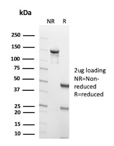 This MAb reacts with an N-terminal epitope (aa 16-25) of both wild type and mutated p53. Mutation and/or allelic loss of p53 is one of the causes of a variety of mesenchymal and epithelial tumors. If it occurs in the germ line, such tumors run in families. In most transformed and tumor cells the concentration of p53 is increased 51000 fold over the minute concentrations (1000 molecules cell) in normal cells, principally due to the increased half-life (4 h) compared to that of the wild-type (20 min). p53 Localizes in the nucleus, but is detectable at the plasma membrane during mitosis and when certain mutations modulate cytoplasmic/nuclear distribution. Mutations arise with an average frequency of 70% but incidence varies from zero in carcinoid lung tumors to 97% in primary melanomas. High concentrations of p53 protein are transiently expressed in human epidermis and superficial dermal fibroblasts following mild ultraviolet irradiation. Positive nuclear staining with p53 antibody has been reported to be a negative prognostic factor in breast carcinoma, lung carcinoma, colorectal, and urothelial carcinoma. Anti-p53 positivity has also been used to differentiate uterine serous carcinoma from endometrioid carcinoma as well as to detect intratubular germ cell neoplasia.