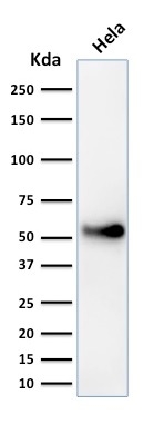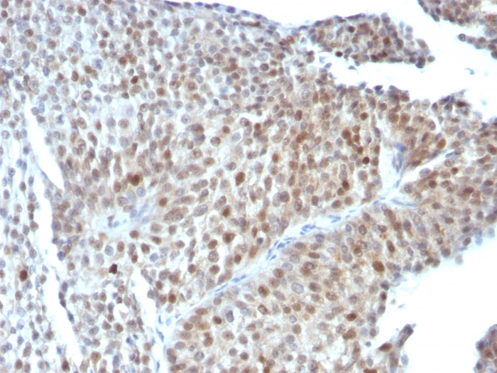 Recognizes a 53kDa protein, which is identified as p53 suppressor gene product. It reacts with the mutant as well as the wild form of p53 under denaturing and non-denaturing conditions. Its epitope maps within the N-terminus (aa 20-25) of p53 oncoprotein. p53 is a tumor suppressor gene expressed in a wide variety of tissue types and is involved in regulating cell growth, replication, and apoptosis. It binds to MDM2, SV40 T antigen and human papilloma virus E6 protein. Positive nuclear staining with p53 antibody has been reported to be a negative prognostic factor in breast carcinoma, lung carcinoma, colorectal, and urothelial carcinoma. Anti-p53 positivity has also been used to differentiate uterine serous carcinoma from endometrioid carcinoma as well as to detect intratubular germ cell neoplasia. Mutations involving p53 are found in a wide variety of malignant tumors, including breast, ovarian, bladder, colon, lung, and melanoma.