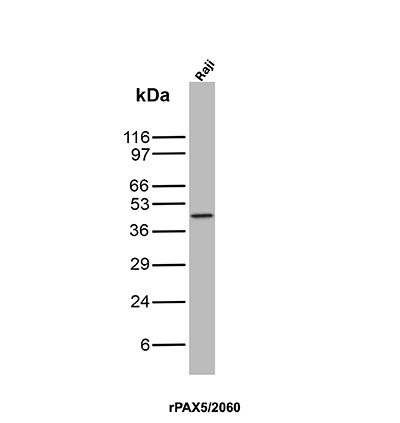 The specificity of this monoclonal antibody to its intended target was validated by HuProtTM Array, containing more than 19,000, full-length human proteins. The PAX5 gene is a member of thepaired box (PAX)family of transcription factors. The central feature of this gene family is a novel, highly conservedDNA-binding domain, known as thepaired box. The PAX proteins are important regulators in early development, and alterations in the expression of their genes are thought to contribute toneoplastic transformation. The PAX5 gene encodes theB-celllineage specific activator protein (BSAP) that is expressed at early, but not late stages of B-cell differentiation. Its expression has also been detected in developing CNS and testis; therefore, PAX5 gene product may not only play an important role in B-cell differentiation, but also in neural development andspermatogenesis.
