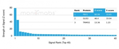 Analysis of Protein Array containing more than 19,000 full-length human proteins using PBX1-Monospecific Mouse Monoclonal Antibody (PCRP-PBX1-3C8). Z- and S- Score: The Z-score represents the strength of a signal that a monoclonal antibody (MAb) (in combination with a fluorescently-tagged anti-IgG secondary antibody) produces when binding to a particular protein on the HuProtTM array. Z-scores are described in units of standard deviations (SD's) above the mean value of all signals generated on that array. If targets on HuProtTM are arranged in descending order of the Z-score, the S-score is the difference (also in units of SD's) between the Z-score. S-score therefore represents the relative target specificity of a MAb to its intended target. A MAb is considered to specific to its intended target, if the MAb has an S-score of at least 2.5. For example, if a MAb binds to protein X with a Z-score of 43 and to protein Y with a Z-score of 14, then the S-score for the binding of that MAb to protein X is equal to 29.