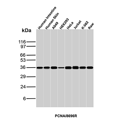 Recognizes a non-histone protein of 36kDa, which is identified as proliferating cell nuclear antigen (PCNA). It is also known as cyclin or polymerase delta auxiliary protein. Elevated expression of PCNA/cyclin has been shown in the nucleus during late G1 phase immediately before the onset of DNA synthesis, becoming maximal during S-phase and declining during G2 and M phases. This MAb is excellent for multiple applications.