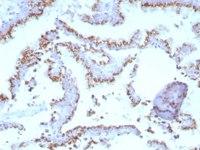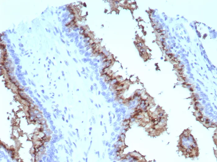 Human prostein is a 553 aa protein identified by cDNA library subtraction and subsequent high � throughput microarray screening of prostate cancer. Prostein has multiple transmembrane domains. Prostein has been shown to be uniquely expressed in normal and cancerous prostatic tissues. By immunohistochemistry, prostein is expressed in the vast majority of normal and malignant prostatic tissues, regardless of grade and metastatic status. No protein expression is detected in normal and malignant tissue samples representing the great majority of essential tissues and tumors. In particular, prostein is expressed in most of poorly differentiated prostatic carcinoma, including small cell prostate carcinoma. Prostein is more specific and sensitive for prostatic carcinomas than PSA and PSAP.