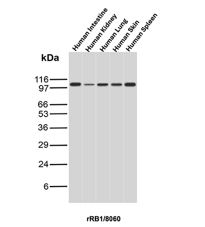 Recognizes a 105kDa phosphoprotein, identified as retinoblastoma (Rb) gene product. Its epitope is localized between aa 703-772. It shows no cross reaction with p107 or p130. It specifically stains the nuclei of BT-20 cells and primary human foreskin fibroblast (HFF) cells. It does not stain the Rb-negative BT549 cells. It reacts with the hyperphosphorylated as well as the un (under) phosphorylated form of the Rb protein. Retinoblastoma gene product plays a key role in cell cycle control. It has been identified as a tumor suppressor gene whose loss of its function leads to tumor development. It is widely expressed in a variety of human tissues including breast, esophageal, squamous cell and cervical carcinoma.
