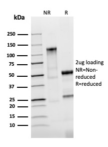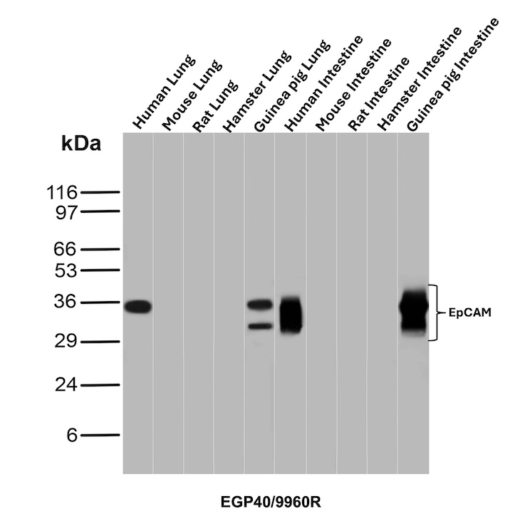 Epitope of this MAb is mapped between aa 202-212 of EGP40, which is a 40-43kDa transmembrane epithelial glycoprotein, also identified as epithelial specific antigen (ESA), or epithelial cellular adhesion molecule (Ep-CAM). It is expressed on baso-lateral cell surface in most simple epithelia and a vast majority of carcinomas. Antibody to Ep-CAM has been used to distinguish adenocarcinoma from pleural mesothelioma and hepatocellular carcinoma. This antibody is also useful in distinguishing serous carcinomas of the ovary from mesothelioma.