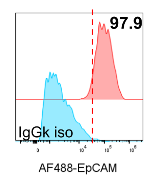 Flow Cytometric Analysis of CAPAN-2 cells using EpCAM Recombinant Rabbit Monoclonal Antibody (EGP40/9774R). Goat anti-Rabbit IgG-CF488 (red); Isotype Control (blue).