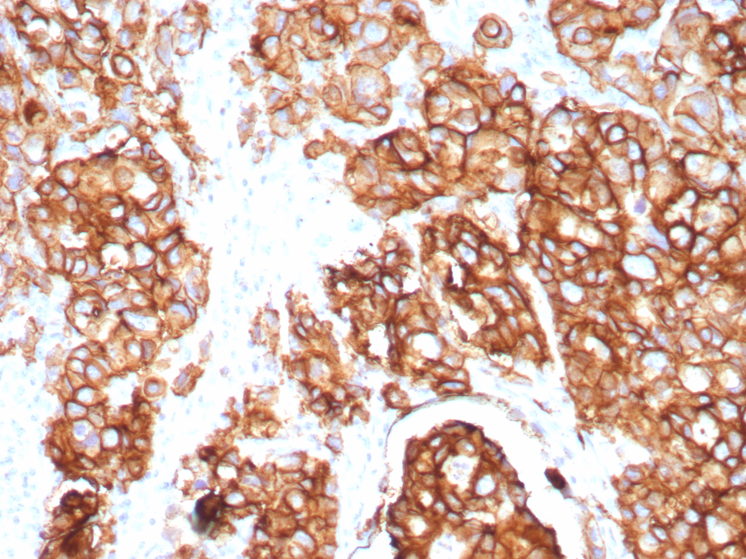 Binding epitope of this antibody is located in the first EGF-like repeat domain (EGF1) between amino acids 27-59 of Ep-CAM.EGP40 is a 40-43kDa transmembrane epithelial glycoprotein, also identified as epithelial specific antigen (ESA), or epithelial cellular adhesion molecule (Ep-CAM). It is expressed on baso-lateral cell surface in most simple epithelia and a vast majority of carcinomas with the exception of adult squamous epithelium, hepatocytes and gastric epithelial cells. This antibody has been used to distinguish adenocarcinoma from pleural mesothelioma and hepatocellular carcinoma. This antibody is also useful in distinguishing serous carcinomas of the ovary from mesothelioma.