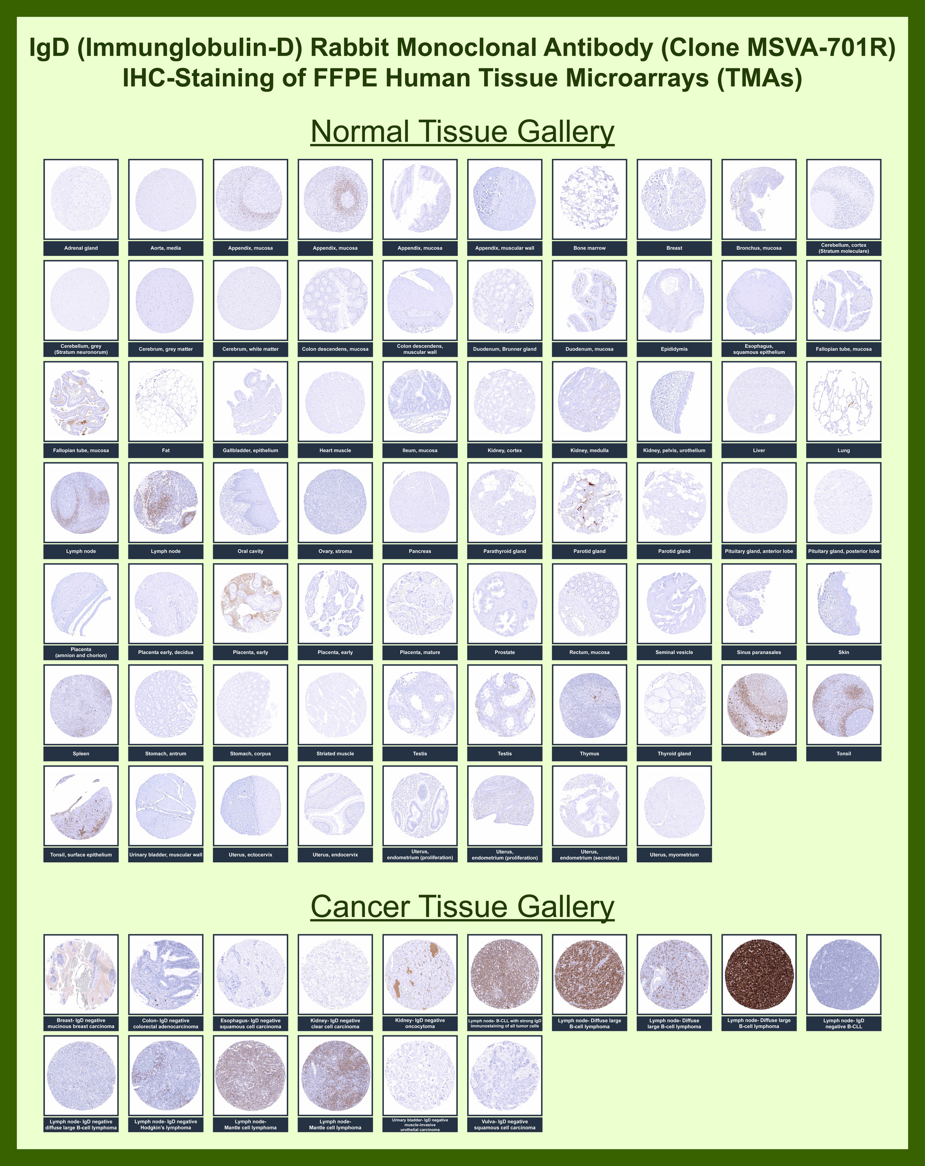 Immunoglobulins are four-chain, Y-shaped, monomeric structures comprised of two identical heavy chains and two identical light chains held together through interchain disulfide bonds. The chains form two domains, the Fab (antigen binding) fragment and the Fc (constant) fragment. Immunoglobulin D (IgD) exists as a monomer with Î � heavy chains and either Î � or Î � light chains. It plays a biological role as a transmembrane receptor molecule, co-expressed with IgM on the surface of mature/naive B cells. In particular, it is found on spleen B cell surfaces. Compared to IgM, IgD exists in much lower numbers and is not expressed on immature B cells. IgD surface expression on B cells is regulated in part by IL-27. In mice, the inhibition of this immunoglobulin isotype does not cause a significant change to the immune system.
