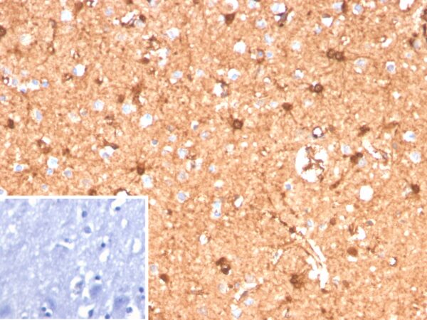 Formalin-fixed, paraffin-embedded human brain stained with S100B Rabbit Recombinant Monoclonal Antibody (S100B/12587R). Inset: PBS instead of primary antibody; secondary only negative control.