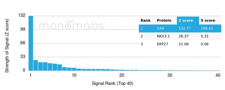 Analysis of Protein Array containing more than 19,000 full-length human proteins using CAIX-Monospecific Mouse Monoclonal Antibody (CA9/3407). Z- and S- Score: The Z-score represents the strength of a signal that a monoclonal antibody (MAb) (in combination with a fluorescently-tagged anti-IgG secondary antibody) produces when binding to a particular protein on the HuProtTM array. Z-scores are described in units of standard deviations (SD's) above the mean value of all signals generated on that array. If targets on HuProtTM are arranged in descending order of the Z-score, the S-score is the difference (also in units of SD's) between the Z-score. S-score therefore represents the relative target specificity of a MAb to its intended target. A MAb is considered to specific to its intended target, if the MAb has an S-score of at least 2.5. For example, if a MAb binds to protein X with a Z-score of 43 and to protein Y with a Z-score of 14, then the S-score for the binding of that MAb to protein X is equal to 29.