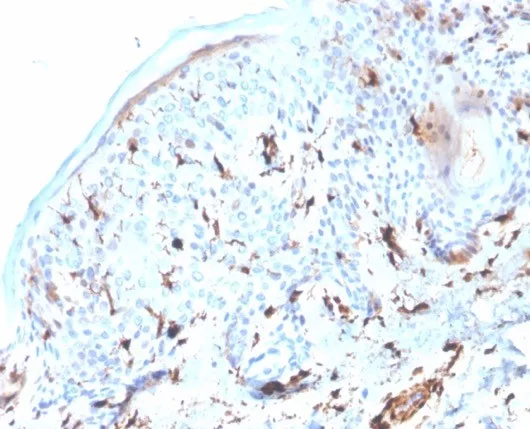Formalin-fixed, paraffin-embedded human skin stained with S100A4 Mouse Monoclonal Antibody (S100A4/6995). HIER: Tris/EDTA, pH9.0, 45min. 2°C: HRP-polymer, 30min. DAB, 5min.