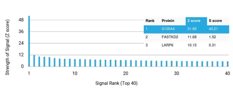 Analysis of Protein Array containing more than 19,000 full-length human proteins using S100A4 Mouse Monoclonal Antibody (S100A4/6995). Z- and S- Score: The Z-score represents the strength of a signal that a monoclonal antibody (MAb) (in combination with a fluorescently-tagged anti-IgG secondary antibody) produces when binding to a particular protein on the HuProtTM array. Z-scores are described in units of standard deviations (SD's) above the mean value of all signals generated on that array. If targets on HuProtTM are arranged in descending order of the Z-score, the S-score is the difference (also in units of SD's) between the Z-score. S-score therefore represents the relative target specificity of a MAb to its intended target. A MAb is considered to specific to its intended target, if the MAb has an S-score of at least 2.5. For example, if a MAb binds to protein X with a Z-score of 43 and to protein Y with a Z-score of 14, then the S-score for the binding of that MAb to protein X is equal to 29.