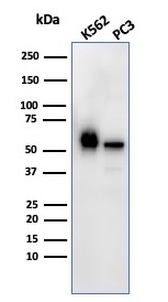 Western Blot Analysis of K562 and PC3 cell lysate using SERBP1 Mouse Monoclonal Antibody (SERBP1/3492).
