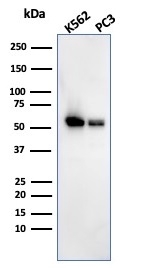 Western Blot Analysis of K562 and PC3 cell lysates using SERBP1 Mouse Monoclonal Antibody (SERBP1/3493).