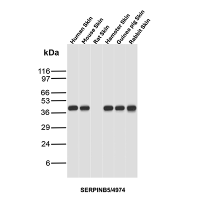 Analysis of Protein Array containing more than 19,000 full-length human proteins using SERPINB5 / Maspin Mouse Monoclonal Antibody (SERPINB5/4974). Z- and S- Score: The Z-score represents the strength of a signal that a monoclonal antibody (MAb) (in combination with a fluorescently-tagged anti-IgG secondary antibody) produces when binding to a particular protein on the HuProtTM array. Z-scores are described in units of standard deviations (SD's) above the mean value of all signals generated on that array. If targets on HuProtTM are arranged in descending order of the Z-score, the S-score is the difference (also in units of SD's) between the Z-score. S-score therefore represents the relative target specificity of a MAb to its intended target. A MAb is considered to specific to its intended target, if the MAb has an S-score of at least 2.5. For example, if a MAb binds to protein X with a Z-score of 43 and to protein Y with a Z-score of 14, then the S-score for the binding of that MAb to protein X is equal to 29.