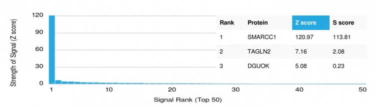 Analysis of Protein Array containing more than 19,000 full-length human proteins using SMARCC1 / BAF155 Mouse Monoclonal Antibody (PCRP-SMARCC1-1F1). Z- and S- Score: The Z-score represents the strength of a signal that a monoclonal antibody (MAb) (in combination with a fluorescently-tagged anti-IgG secondary antibody) produces when binding to a particular protein on the HuProtTM array. Z-scores are described in units of standard deviations (SD's) above the mean value of all signals generated on that array. If targets on HuProtTM are arranged in descending order of the Z-score, the S-score is the difference (also in units of SD's) between the Z-score. S-score therefore represents the relative target specificity of a MAb to its intended target. A MAb is considered to specific to its intended target, if the MAb has an S-score of at least 2.5. For example, if a MAb binds to protein X with a Z-score of 43 and to protein Y with a Z-score of 14, then the S-score for the binding of that MAb to protein X is equal to 29.