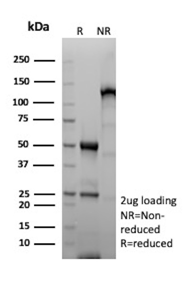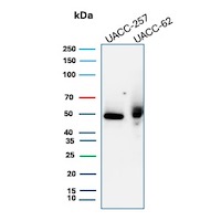 SOX genes comprise a family of genes that are related to the mammalian sex-determining gene SRY. These genes similarly contain sequences that encode for the HMG-box domain, which is responsible for the sequence-specific DNA-binding activity. SOX-10 is a sensitive marker of melanoma, including conventional, spindled, and desmoplastic subtypes. It is expressed by metastatic melanomas and nodal capsular nevus in sentinel lymph nodes, but not by other lymph node components such as dendritic cells, which usually express S100 protein. Commonly used melanoma markers, such as anti-HMB-45 and anti-Melan-A, are poorly expressed in desmoplastic melanomas while SOX-10 is moderately to strongly expressed in desmoplastic melanomas. SOX-10 is considered as a very reliable marker for recognizing residual desmoplastic melanomas. In normal tissues, it is expressed in Schwann cells, melanocytes, and myoepithelial cells of salivary, bronchial and mammary glands. SOX-10 expression is also observed in mast cells.