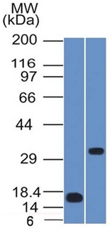 Western Blot of Recombinant SOX2 protein fragment and NCCIT cell lysate using SOX2 Mouse Monoclonal Antibody (SOX2/1791).