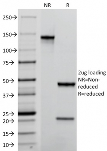 SDS-PAGE Analysis Purified TACSTD2 / TROP2 Mouse Monoclonal Antibody (TACSTD2/2152). Confirmation of Integrity and Purity of Antibody.