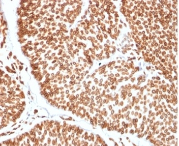 Formalin-fixed, paraffin-embedded human bladder carcinoma stained with TCF4 Mouse Monoclonal Antibody (TCF4/2252) at 2ug/ml. HIER: Tris/EDTA, pH9.0, 45min. 2°C: HRP-polymer, 30min. DAB, 5min.