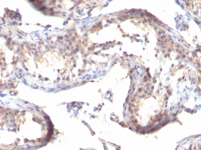 This antibody reacts with the C-terminus of TGF alpha and shows no cross-reaction with EGF and the neuropeptide synenkephalin. The staining with Ab-1 is completely blocked by the peptide used for raising this antibody. TGF (aa50) is a growth factor with 33% homology to EGF, binds to EGFR, activates tyrosine phosphorylation of the receptor, and stimulates cell proliferation. It plays a role in tumor initiation by inducing the reversible transformed phenotype.
