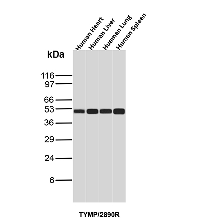 Western Blot Analysis of Human Heart, Human Liver, Human Lung and Human Spleen tissue lysates using Thymidine Phosphorylase Recombinant Rabbit Monoclonal Antibody (TYMP/2890R).