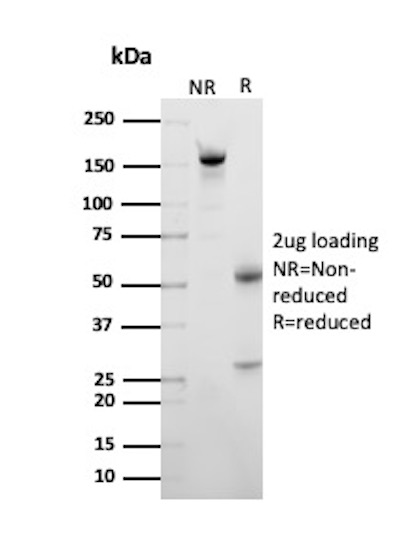 It recognizes a protein of 35kDa, which is identified as tartrate-resistant acid phosphatase (TRAcP). It exists as two isoforms (5a and 5b). This MAb reacts with both the isoforms. Serum TRAcP 5a is secreted by macrophages and dendritic cells and increased in many patients of rheumatoid arthritis.Serum TRAcP 5b is produced from osteoclasts and elevated during bone resorption. TRAcP is an iron containing glycoprotein, which catalyzes the conversion of orthophosphoric monoester to alcohol and orthophosphate. It is the most basic of the acid phosphatases and is the only form not inhibited by L(+)-tartrate. TRAcP is synthesized as a latent proenzyme and is activated by proteolytic cleavage and reduction. Normally, TRAcP is highly expressed by osteoclasts, activated macrophages, neurons and endometrium during pregnancy. Expression of TRAcP is increased in certain pathological conditions such as Leukemic Reticuloendotheliosis (Hairy Cell Leukemia), Gaucher’s Disease, HIV-induced Encephalopathy, Osteoclastoma and in osteoporosis and metabolic bone diseases. Anti-TRAcP antibody labels the cells of Hairy Cell Leukemia (HCL) with a high degree of sensitivity and specificity. Other cells stained with this antibody are tissue macrophages and osteoclasts.