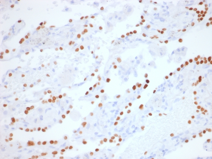 Recognizes a protein of 40kDa, identified as Thyroid transcription factor-1 (TTF-1). TTF-1 is a member of the NKx2 family of homeodomain transcription factors. It is expressed in epithelial cells of the thyroid gland and the lung. Nuclei from liver, stomach, pancreas, small intestine, colon, kidney, breast, skin, testes, pituitary, prostate, and adrenal glands are unreactive. Anti-TTF-1 is useful in differentiating primary adenocarcinoma of the lung from metastatic carcinomas originating in the breast, mediastinal germ cell tumors, and malignant mesothelioma. It can also be used to differentiate small cell lung carcinoma from lymphoid infiltrates.Loss of TTF-1 expression in non-small cell lung carcinoma has been associated with aggressive behavior of such neoplasms. TTF-1 reactivity is also seen in thyroid malignancies.