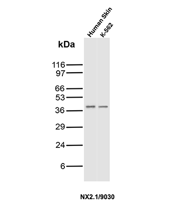 Recognizes a protein of 40kDa, identified as Thyroid transcription factor-1 (TTF-1). TTF-1 is a member of the NKx2 family of homeodomain transcription factors. It is expressed in epithelial cells of the thyroid gland and the lung. Nuclei from liver, stomach, pancreas, small intestine, colon, kidney, breast, skin, testes, pituitary, prostate, and adrenal glands are unreactive. Anti-TTF-1 is useful in differentiating primary adenocarcinoma of the lung from metastatic carcinomas originating in the breast, mediastinal germ cell tumors, and malignant mesothelioma. It can also be used to differentiate small cell lung carcinoma from lymphoid infiltrates.Loss of TTF-1 expression in non-small cell lung carcinoma has been associated with aggressive behavior of such neoplasms. TTF-1 reactivity is also seen in thyroid malignancies.
