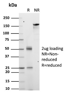 Recognizes a cluster of proteins between 70-80kDa, identified as tyrosinase. Occasionally a minor band at 55kDa is also detected. This MAb shows no cross-reaction with MAGE-1 and tyrosinase-related protein 1, TRP-1/gp75. Tyrosinase is a copper-containing metalloglycoprotein that catalyzes several steps in the melanin pigment biosynthetic pathway; the hydroxylation of tyrosine to L-3,4-dihydroxy-phenylalanine (dopa), and the subsequent oxidation of dopa to dopaquinone. Mutations of the tyrosinase gene occur in various forms of albinism. Tyrosinase is one of the targets for cytotoxic T-cell recognition in melanoma patients. Staining of melanomas with this MAb shows tyrosinase in melanotic as well as amelanotic variants.This MAb is a useful marker for melanocytes and melanomas.