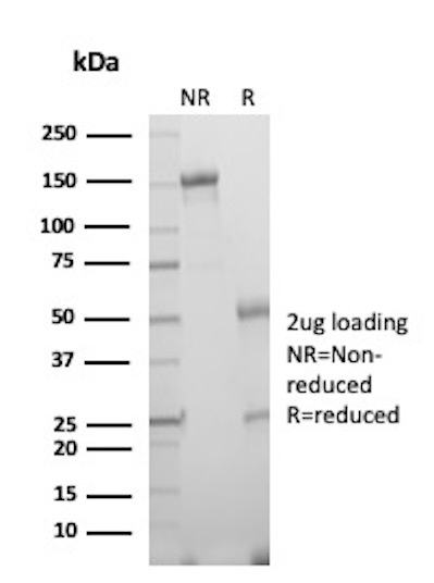 Recognizes a cluster of proteins between 70-80kDa, identified as tyrosinase. Occasionally a minor band at 55kDa is also detected. This MAb shows no cross-reaction with MAGE-1 and tyrosinase-related protein 1, TRP-1/gp75. Tyrosinase is a copper-containing metalloglycoprotein that catalyzes several steps in the melanin pigment biosynthetic pathway; the hydroxylation of tyrosine to L-3,4-dihydroxy-phenylalanine (dopa), and the subsequent oxidation of dopa to dopaquinone. Mutations of the tyrosinase gene occur in various forms of albinism. Tyrosinase is one of the targets for cytotoxic T-cell recognition in melanoma patients. Staining of melanomas with this MAb shows tyrosinase in melanotic as well as amelanotic variants. This MAb is a useful marker for melanocytes and melanomas.